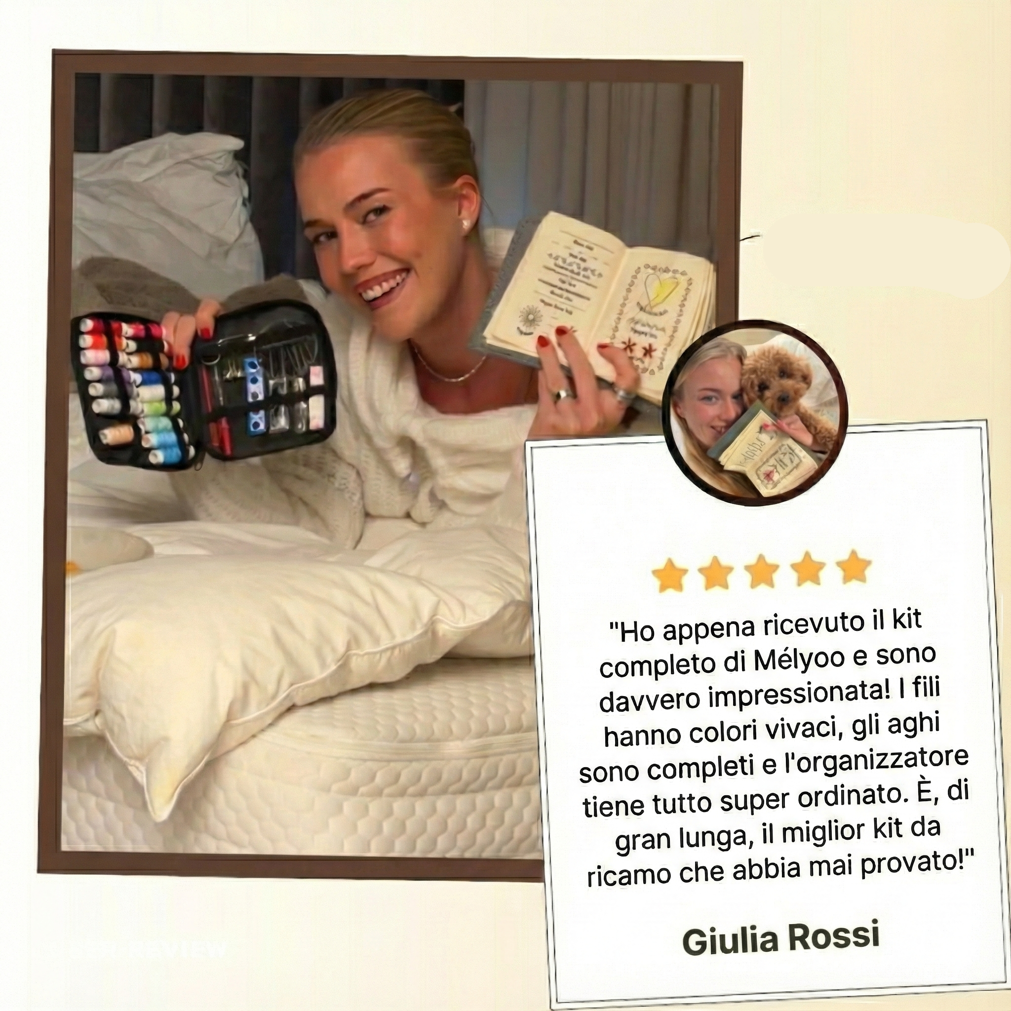 Riceverai un set ultra-completo pronto all'uso o da regalare: il libro di ricamo con pagine in tessuto, fili di tutti i colori, ago, infila-ago e forbici di precisione. Tutto ciò di cui hai bisogno in un'unica confezione!